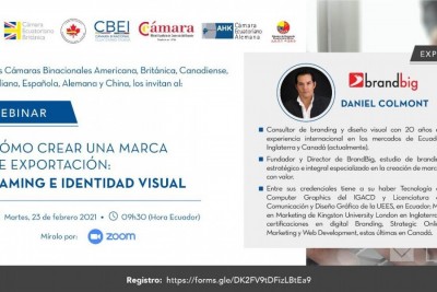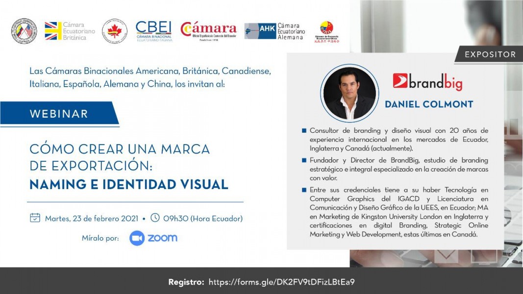 Las Cámaras Binacionales de Guayaquil realizamos la conferencia virtual “Como crear una marca de exportación: Naming e Identidad Visual”, con la magnífica intervención del Sr Daniel Colmont, Consultor de branding y diseño visual con 20 años de experiencia internacional en los mercados de Ecuador, Inglaterra y Canadá.